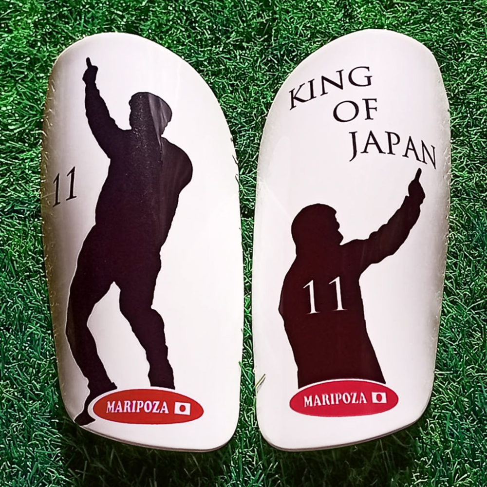 (B)チームのユニフォームに合わせてデザインし尚且つ名前、背番号等を入れた限定品のシンガード。(チームオーダー対応可)